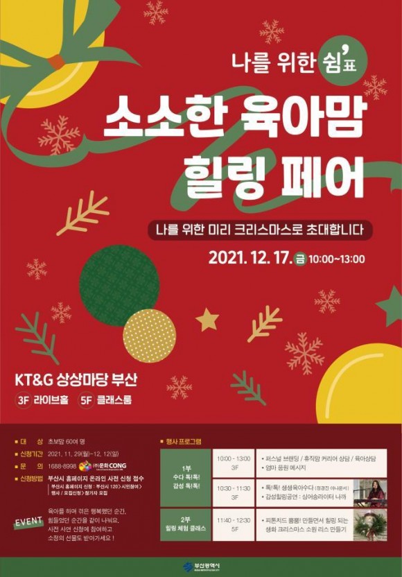 |  | | | ⓒ (주)영남도민일보 | | [영남도민일보] 영남도민일보 기자 = 부산시(시장 박형준)는 오는 12월 17일 오전 10시 부산진구 소재 KT&G 상상마당에서 소소한 육아맘 힐링 페어 ‘나를 위한 쉼표’를 개최한다고 밝혔다.